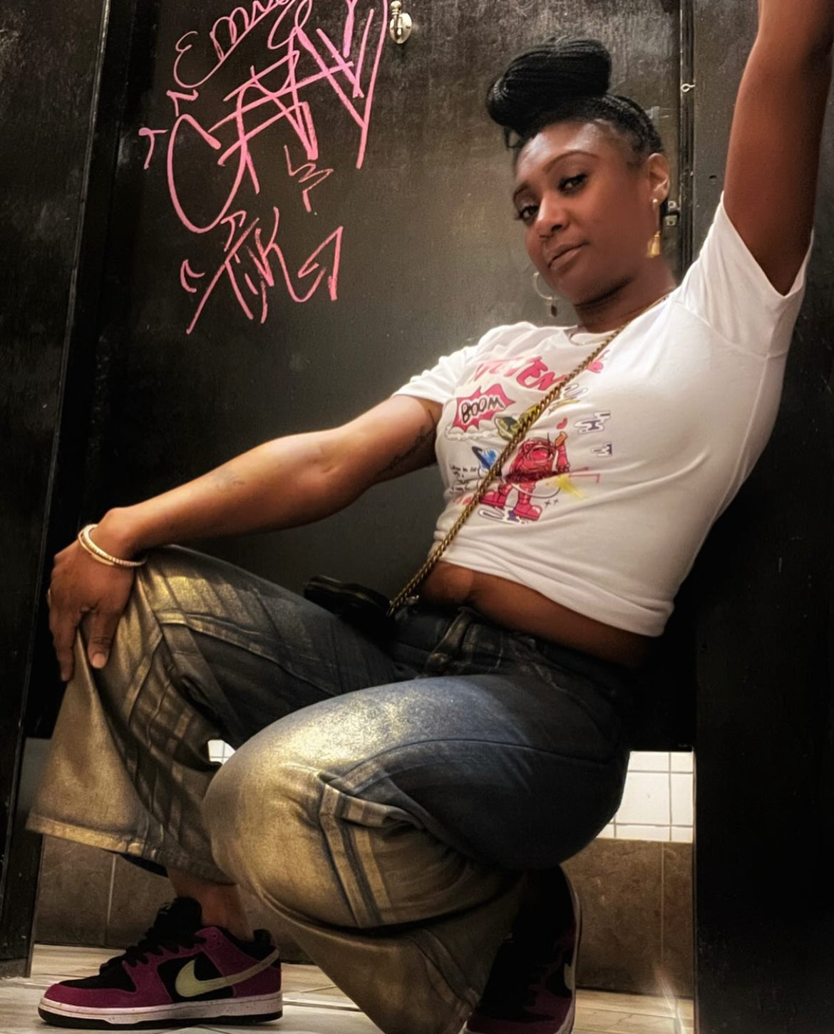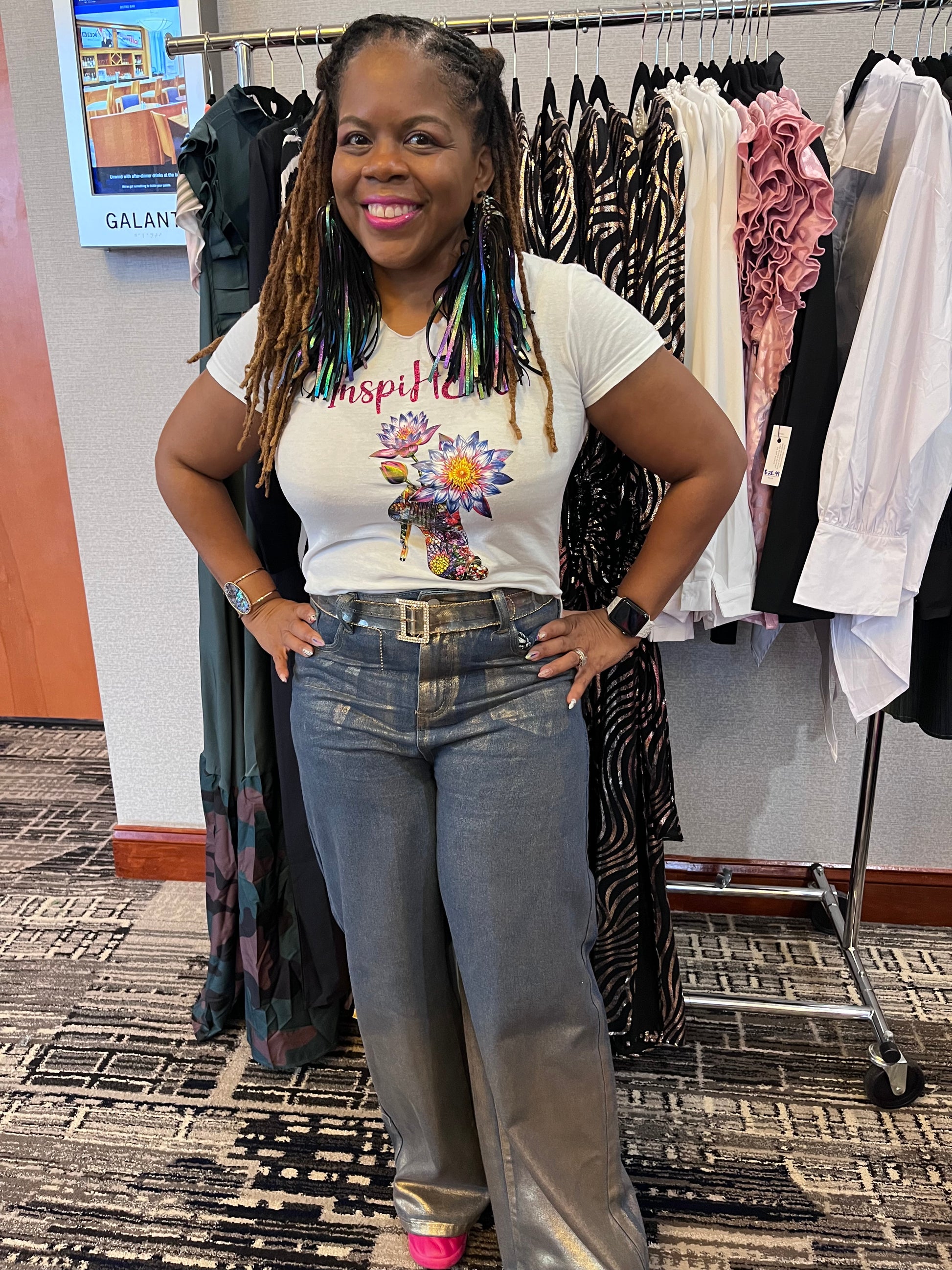 It's not your basic jeans, but just as comfortable! Gold-plated denim, fly front, wide-legged. Non-stretch. If curvy, go size up Sizes: Small to Large (model wearing medium)