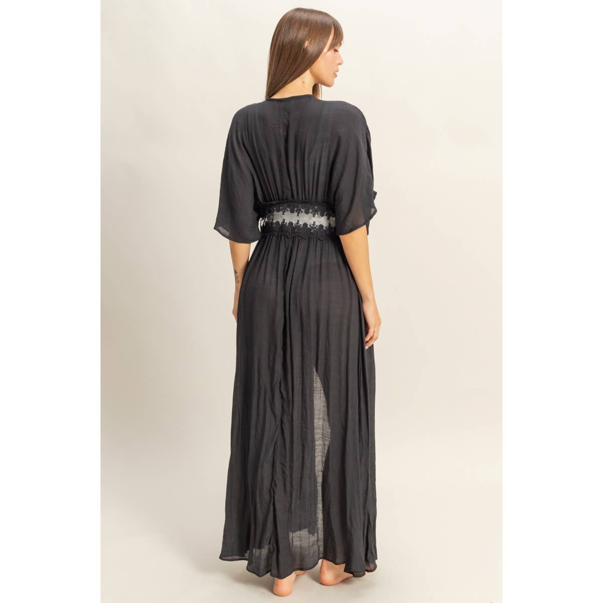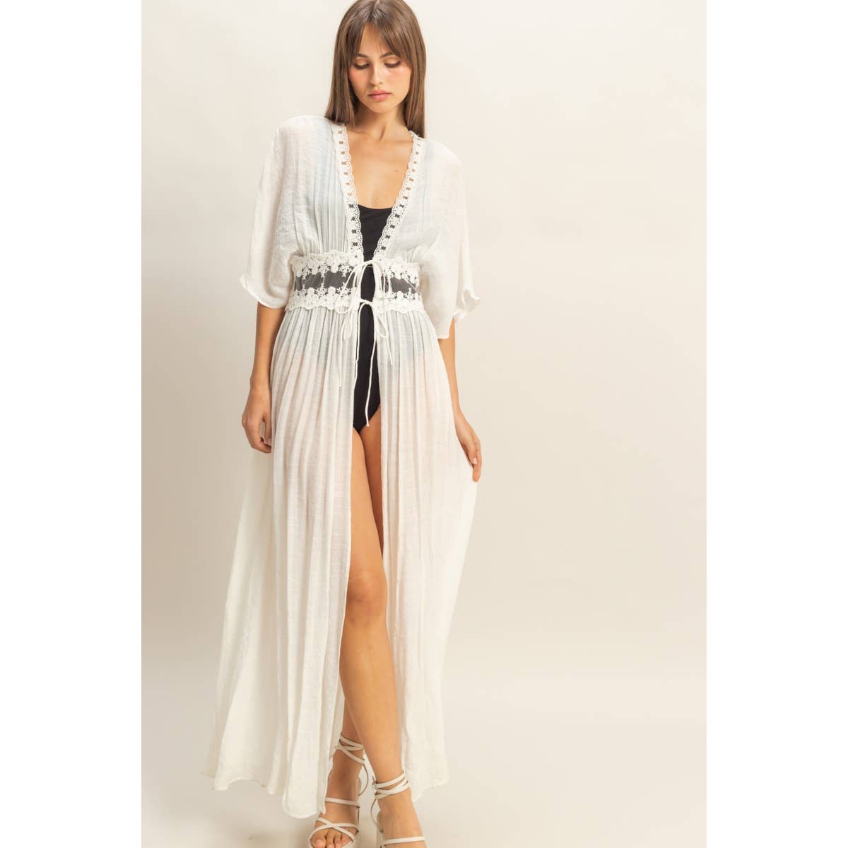 Longline Duster Featuring Elbow-Length Sleeves And A Sheer, Lightweight Construction. Designed With A Lace-Detailed Waist And Tie-Front Closure For Adjustable Fit. Ideal As A Layering Piece For Outfits. 100% Polyester Model Is 5' 8" Tall, 30" Chest, 25" Waist, 35" Hips And Wearing A Size Small Imported.