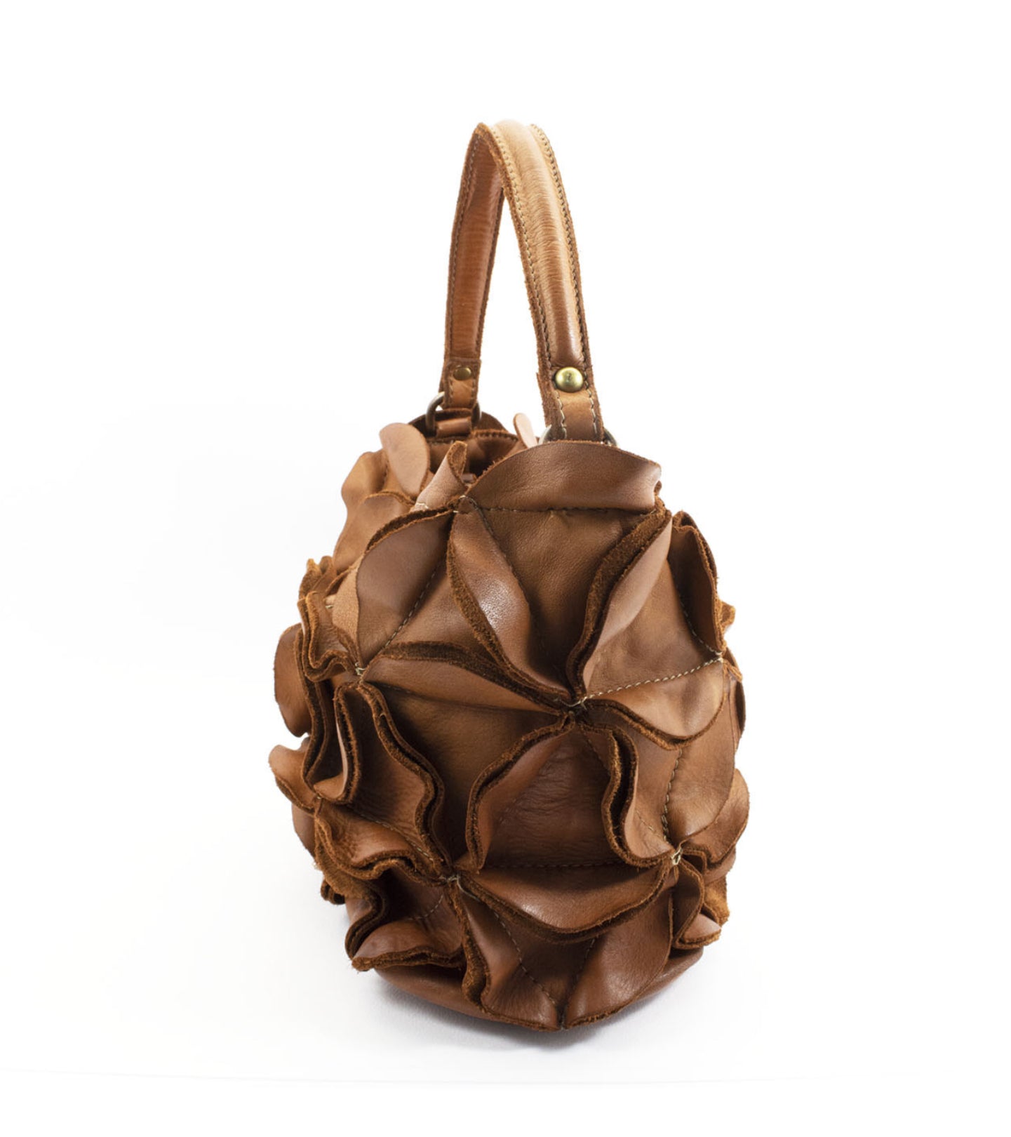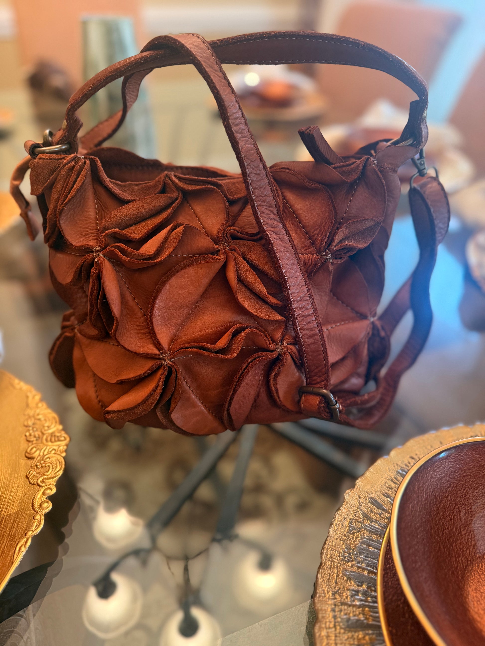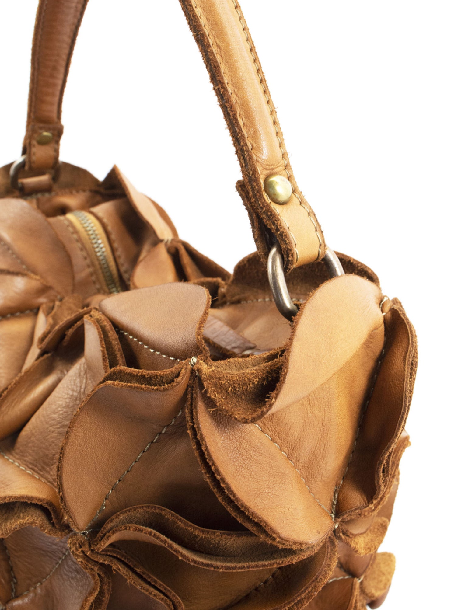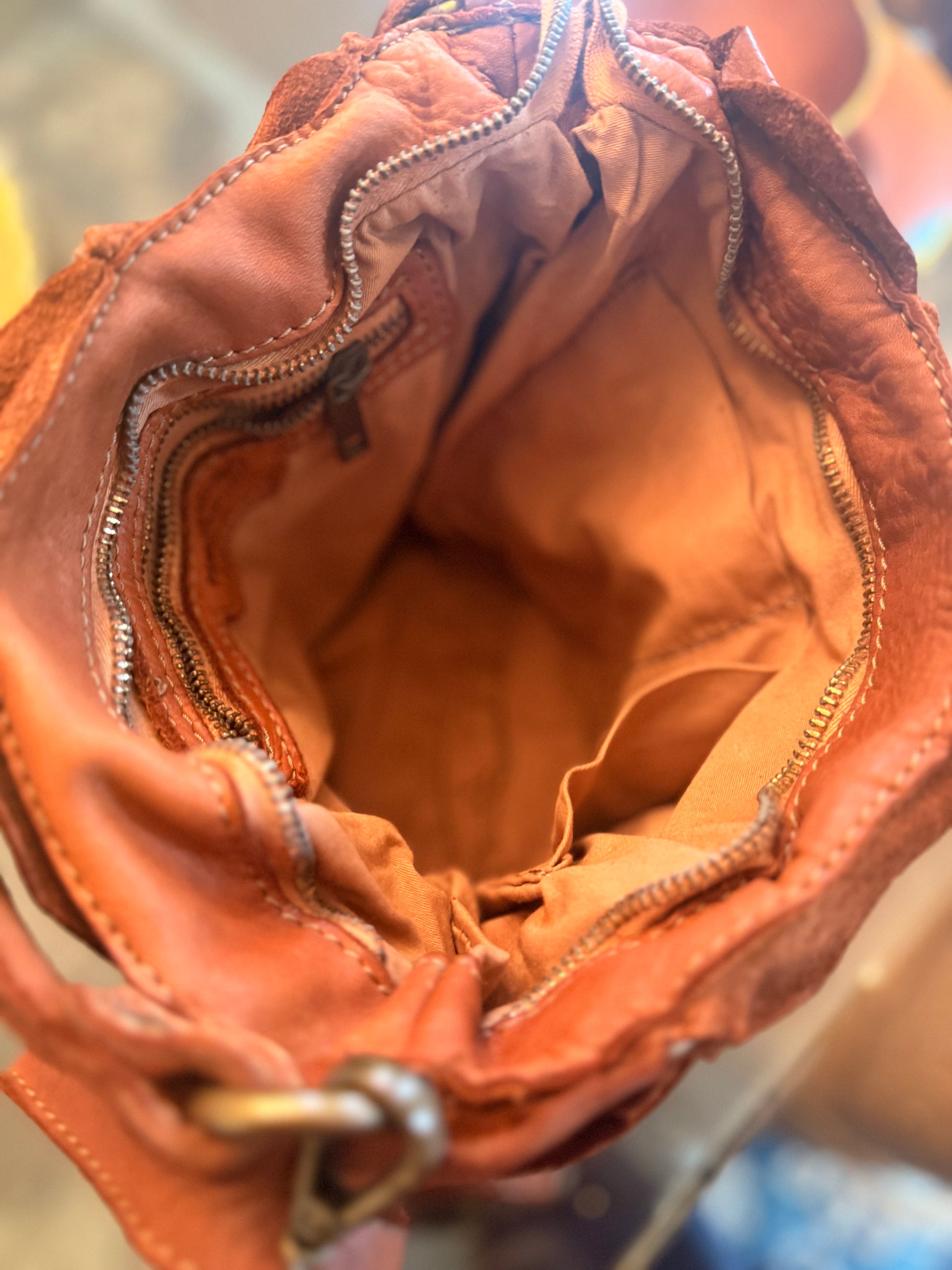 Garment-dyed calfskin bag, special stitched geometric motif.