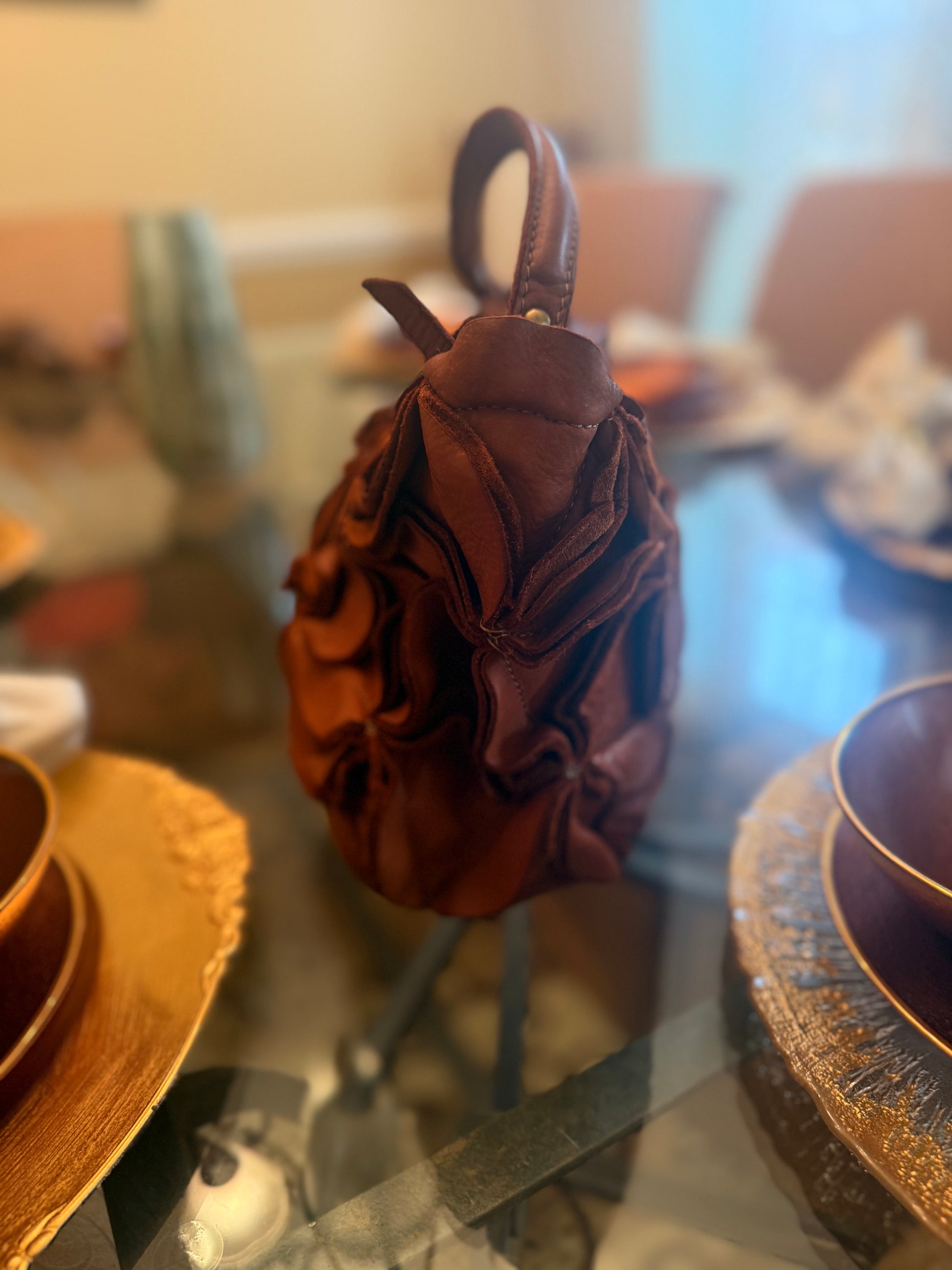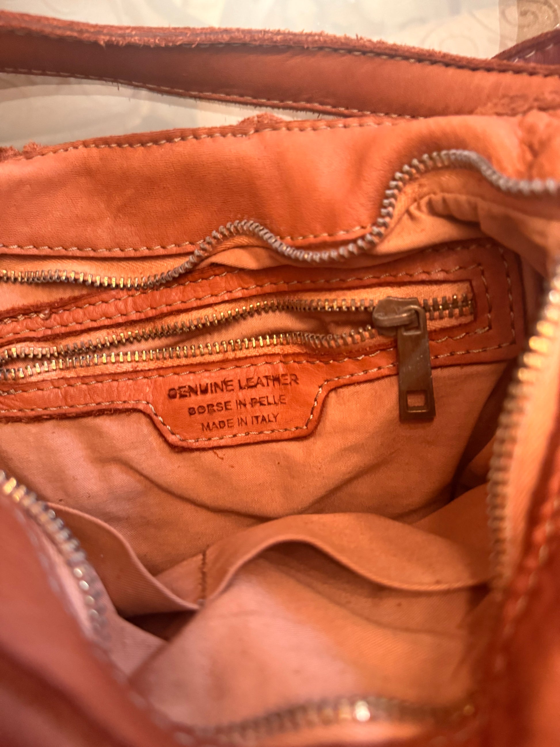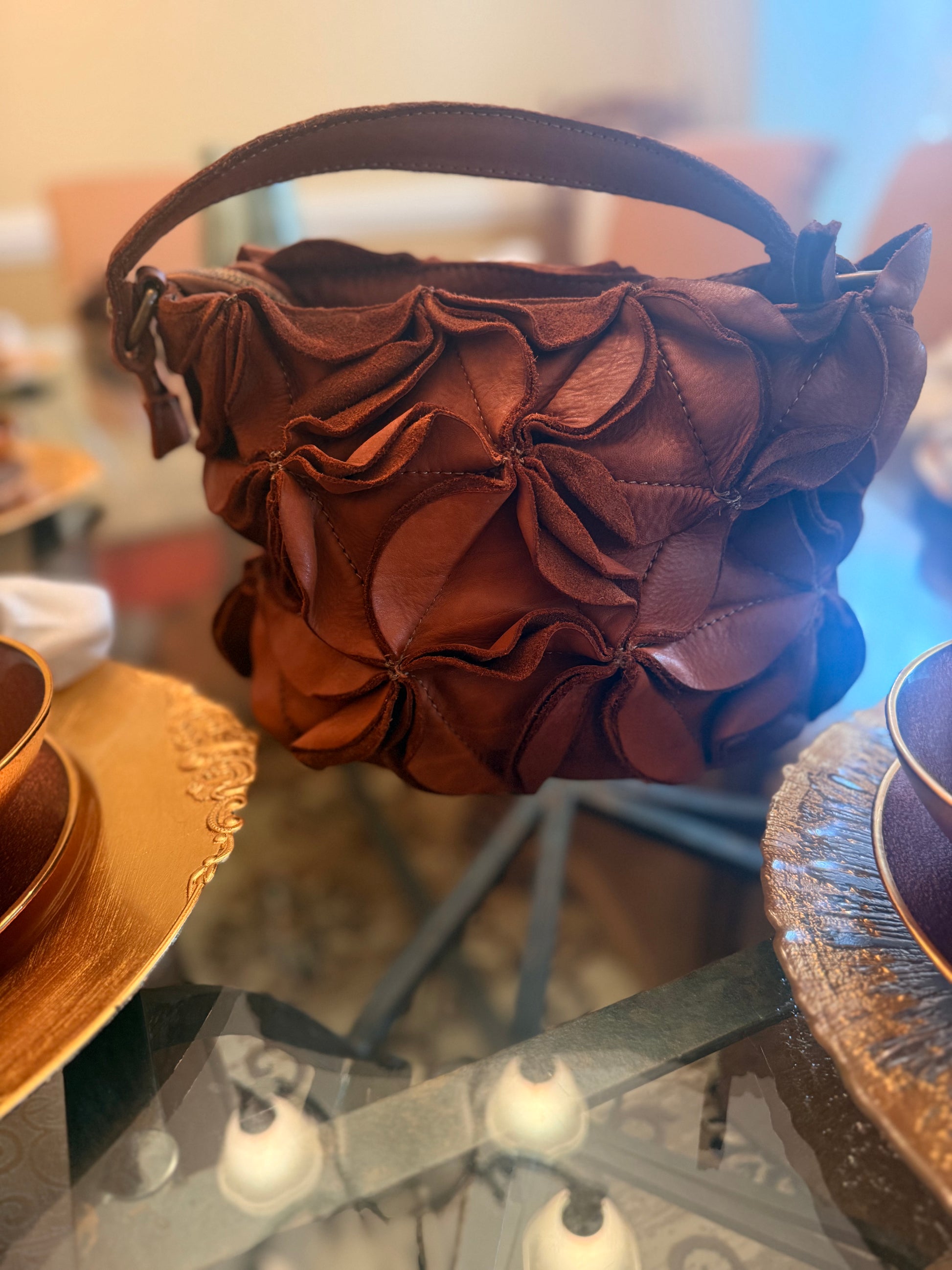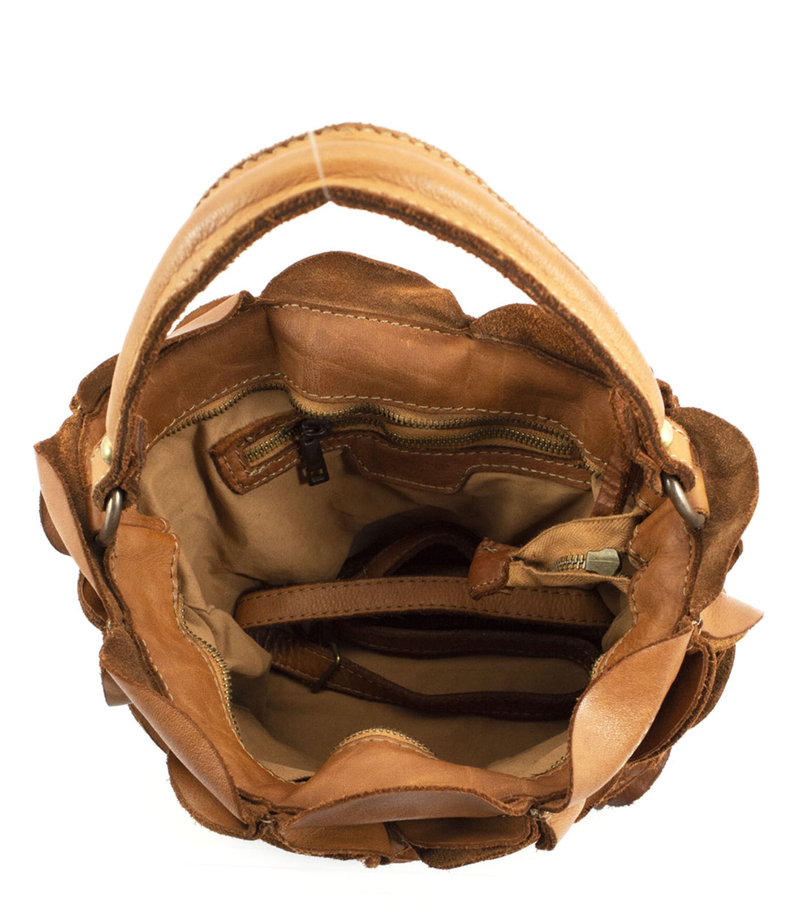 Garment-dyed calfskin bag, special stitched geometric motif.