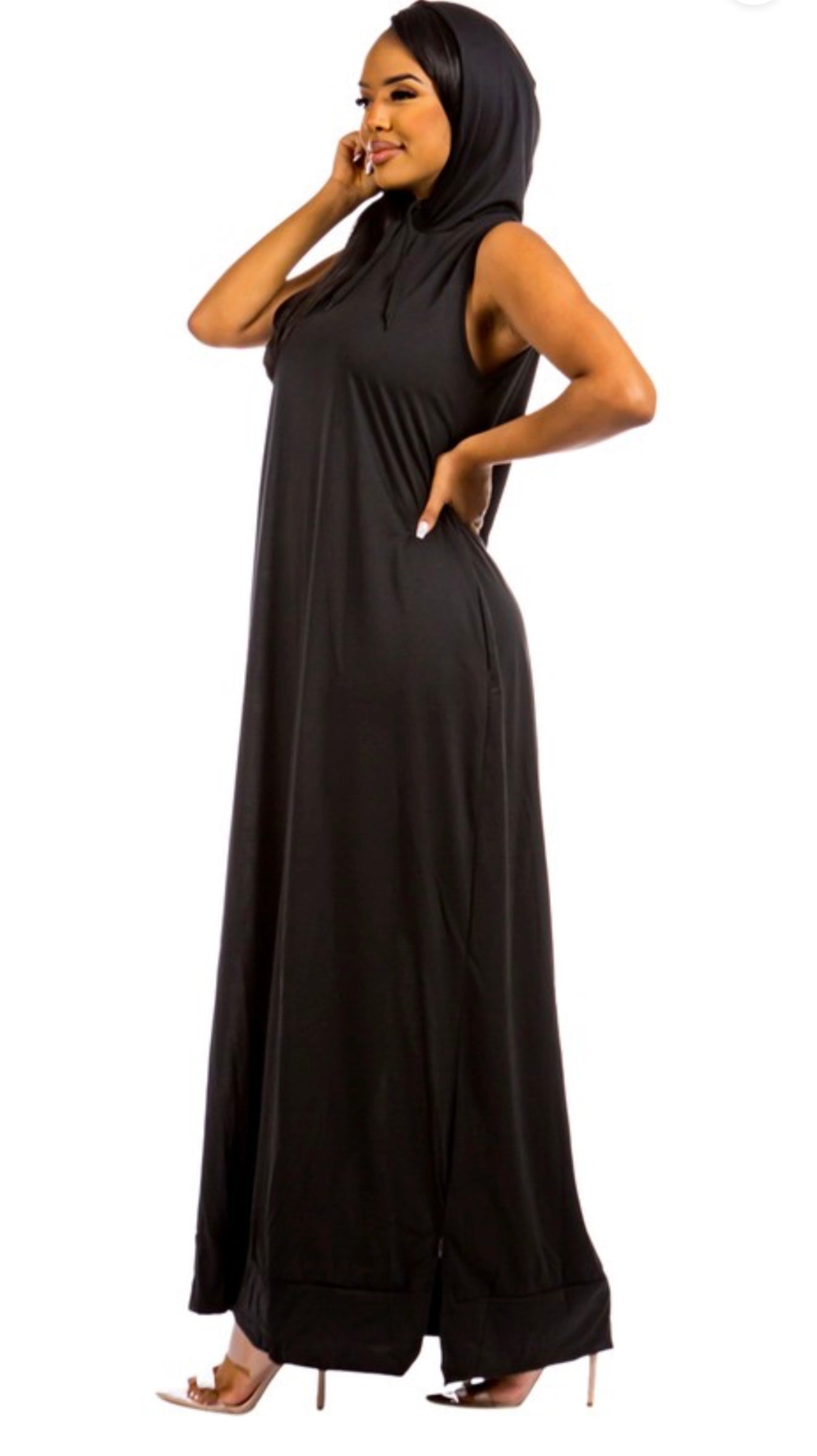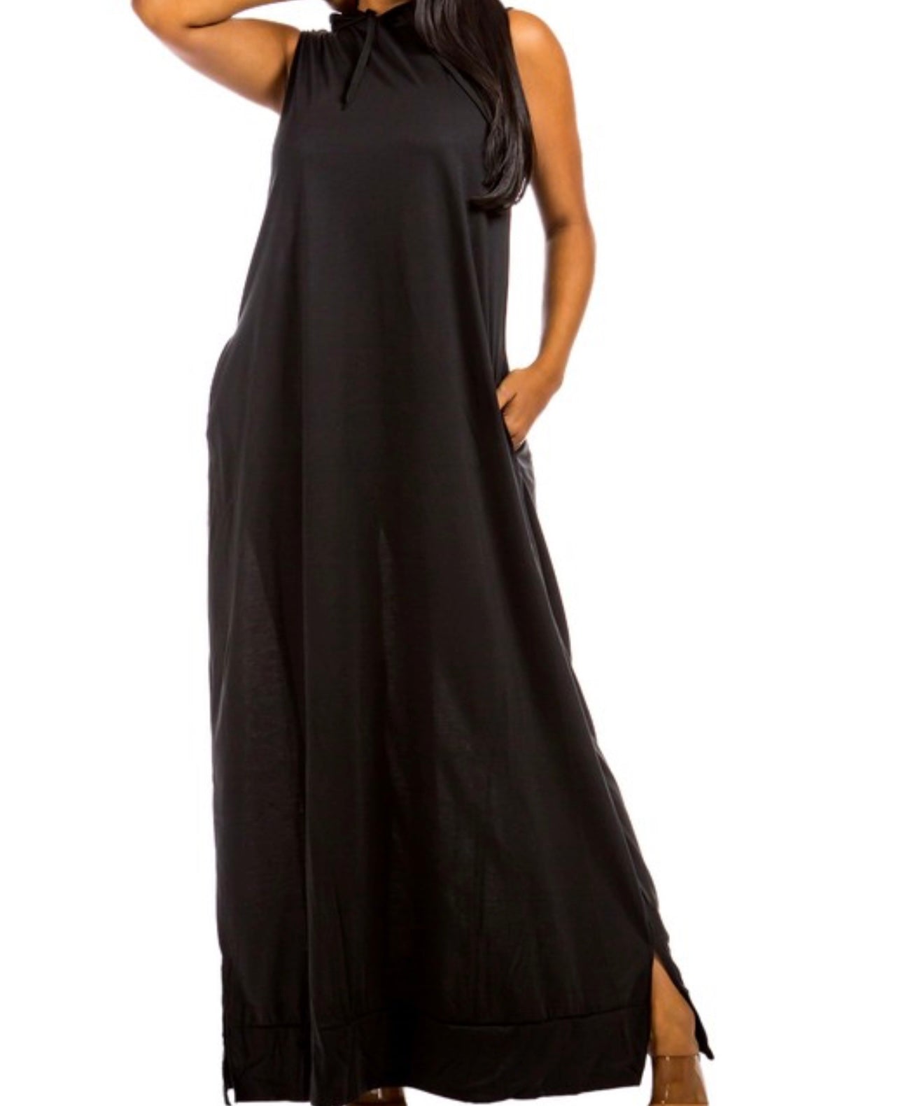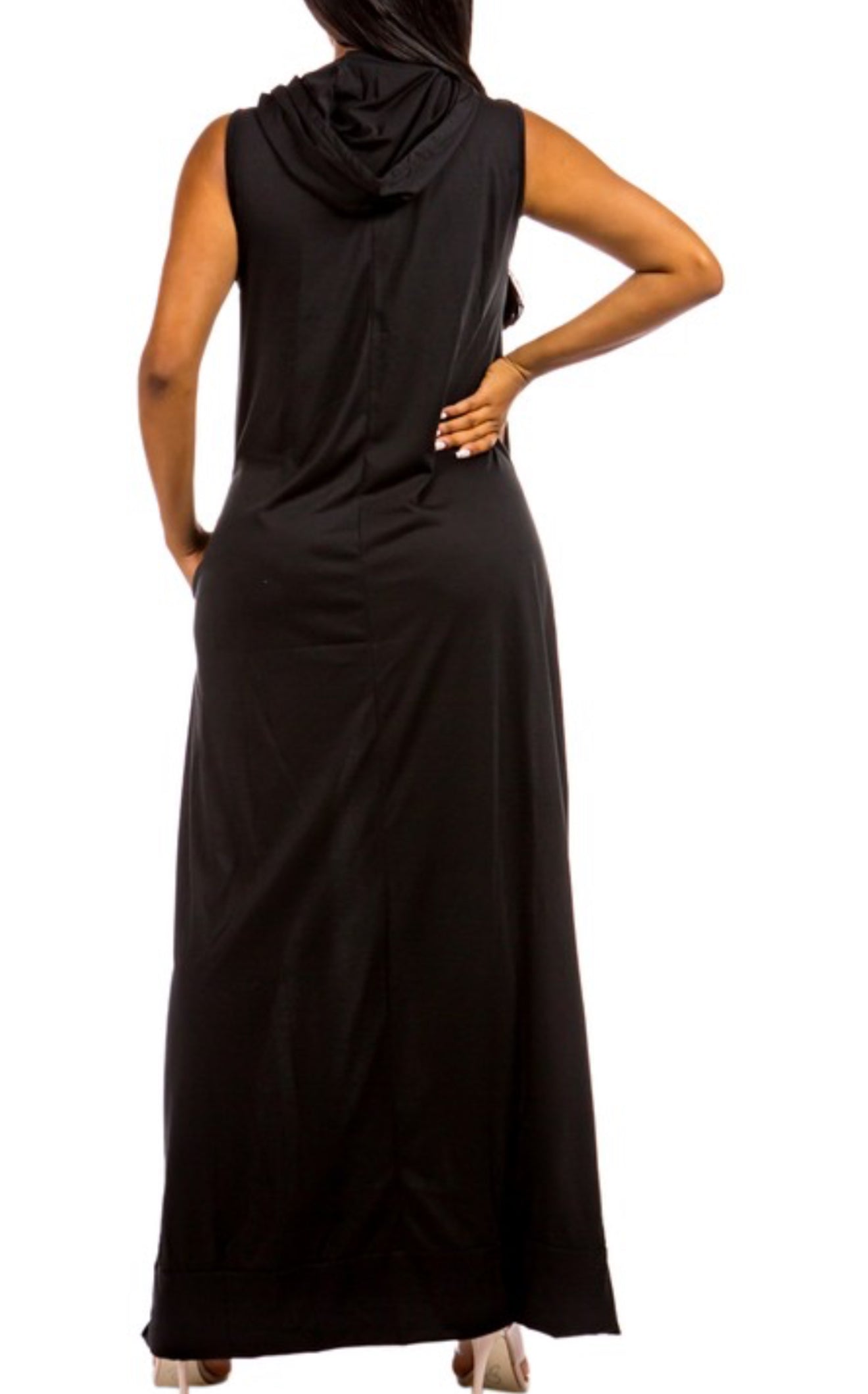 Sexy maxi summer dress, sleeveless, attached hood, side pockets