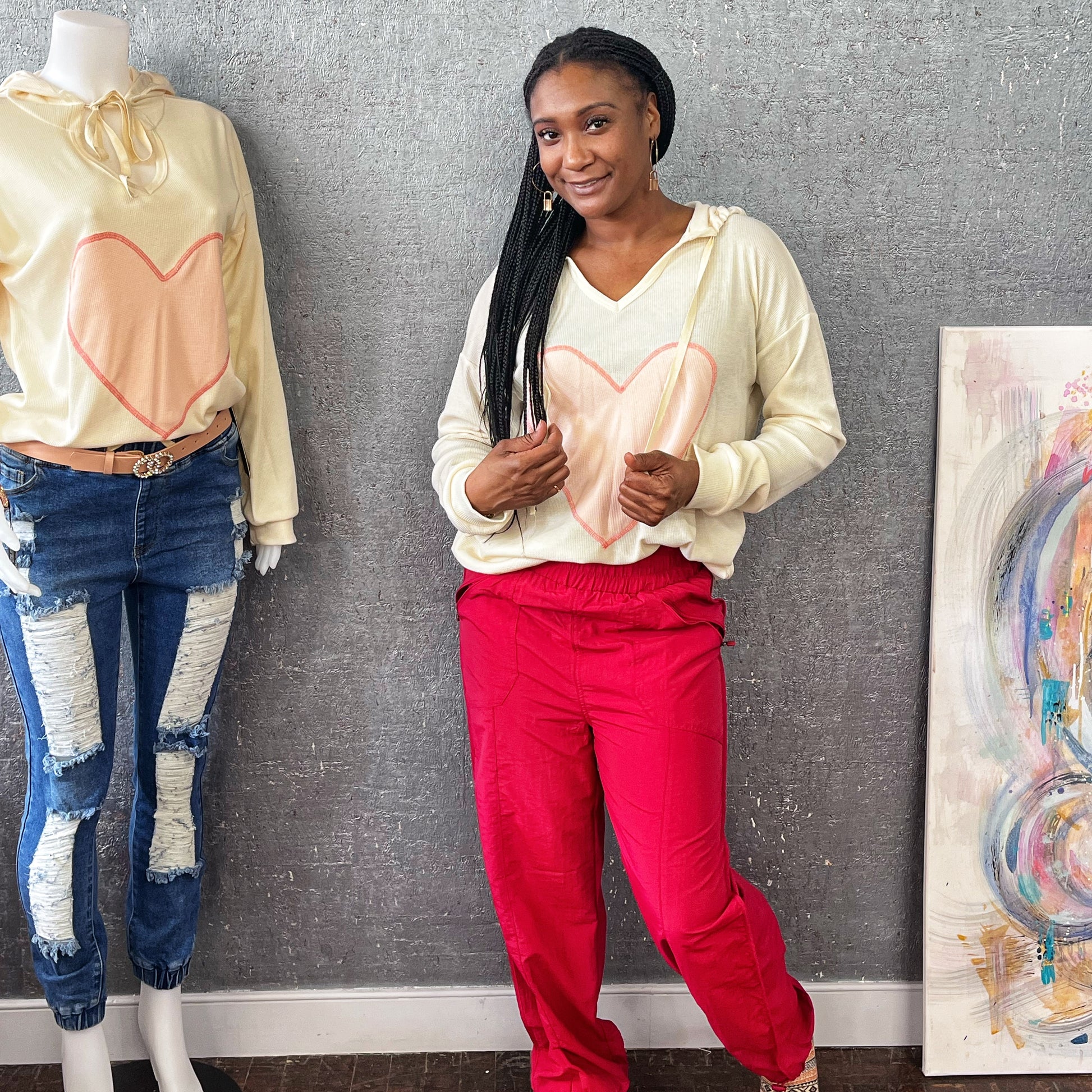 This Valentine Heart Patch Hoodie features a unique heart patch and drawstrings, adding a fun and playful touch to your wardrobe. Made from a comfortable blend of polyester, rayon, and spandex, it's perfect for a galentine party or as a Valentine's Day gift. Stay cozy and stylish with this must-have hoodie.