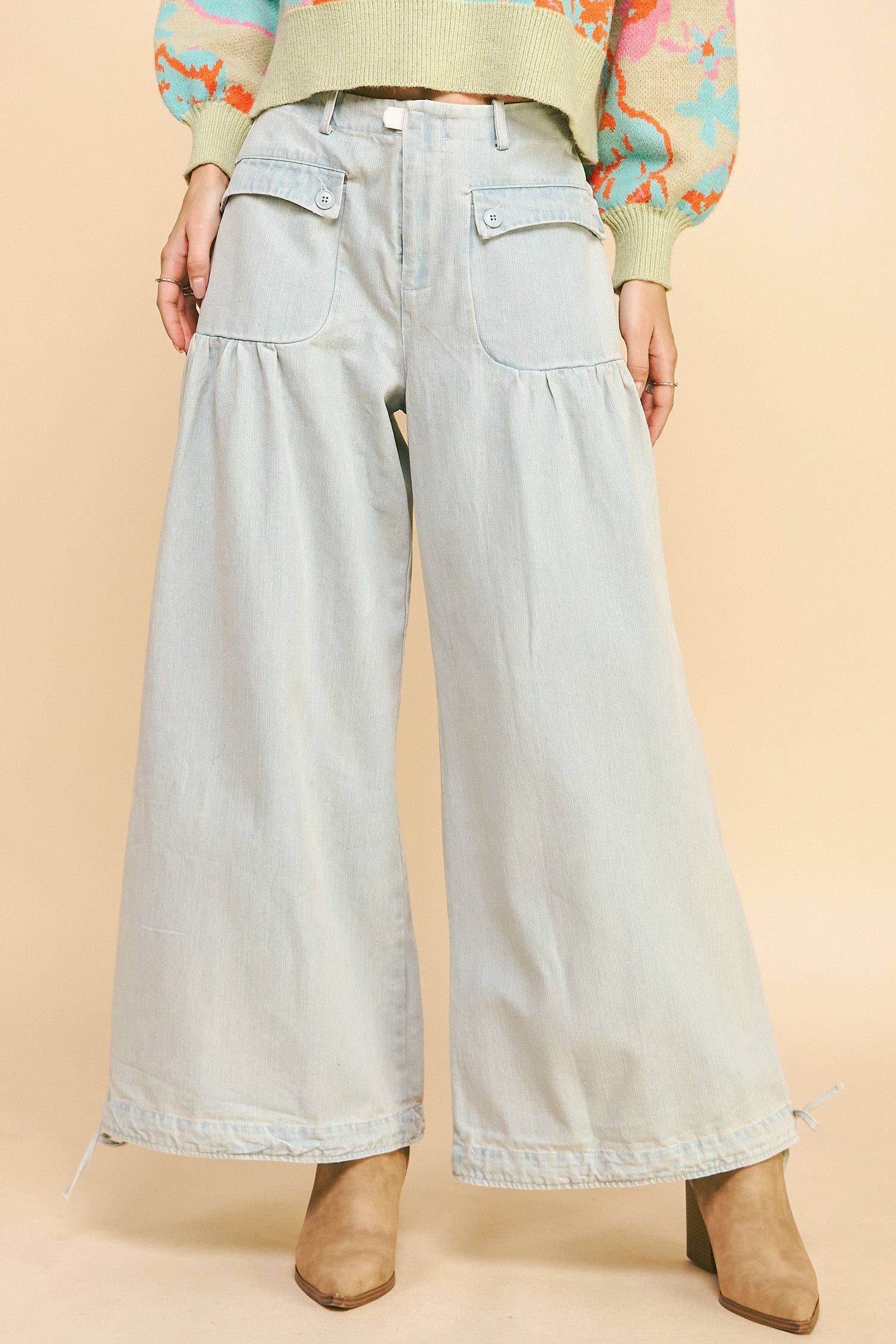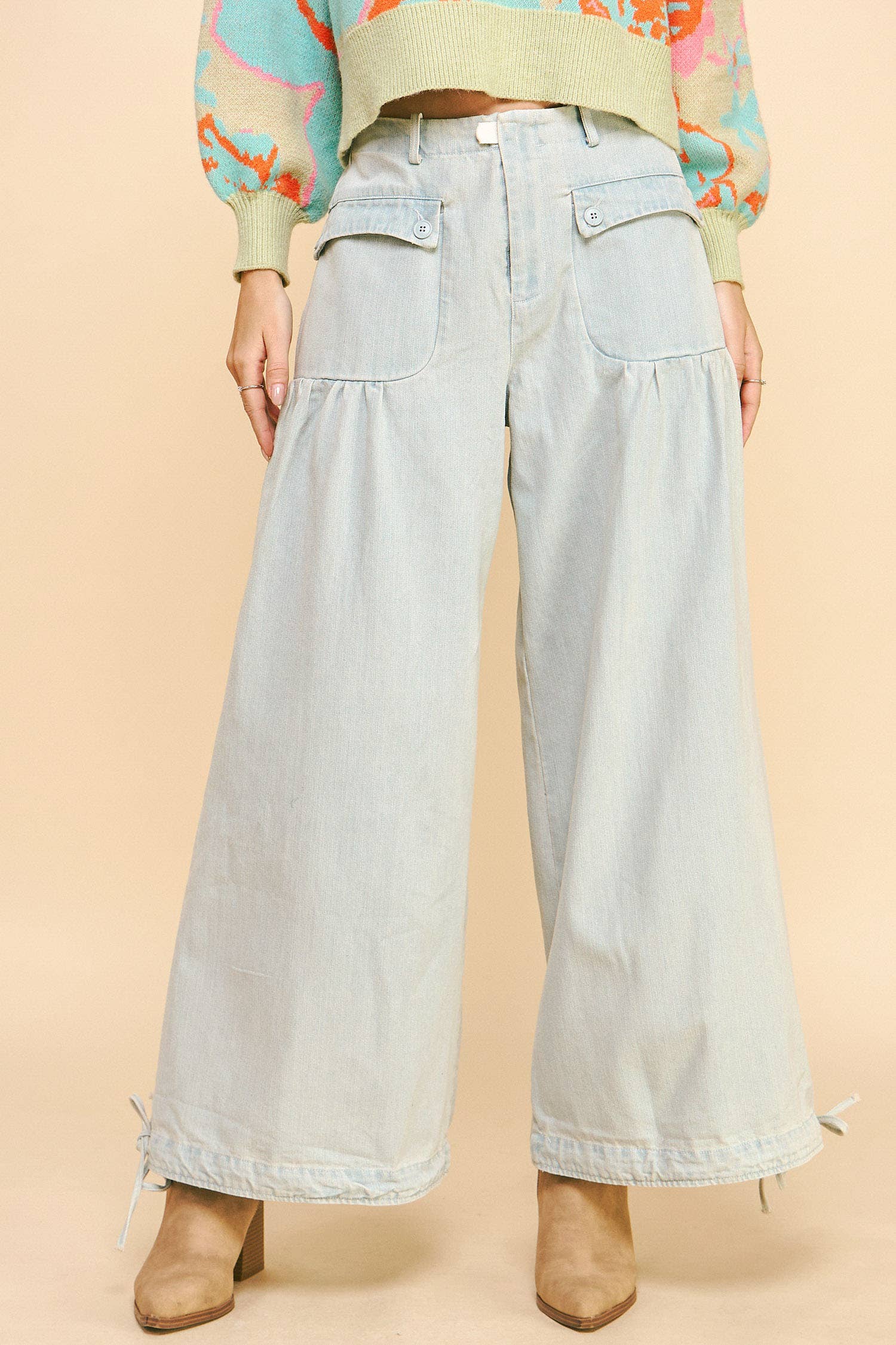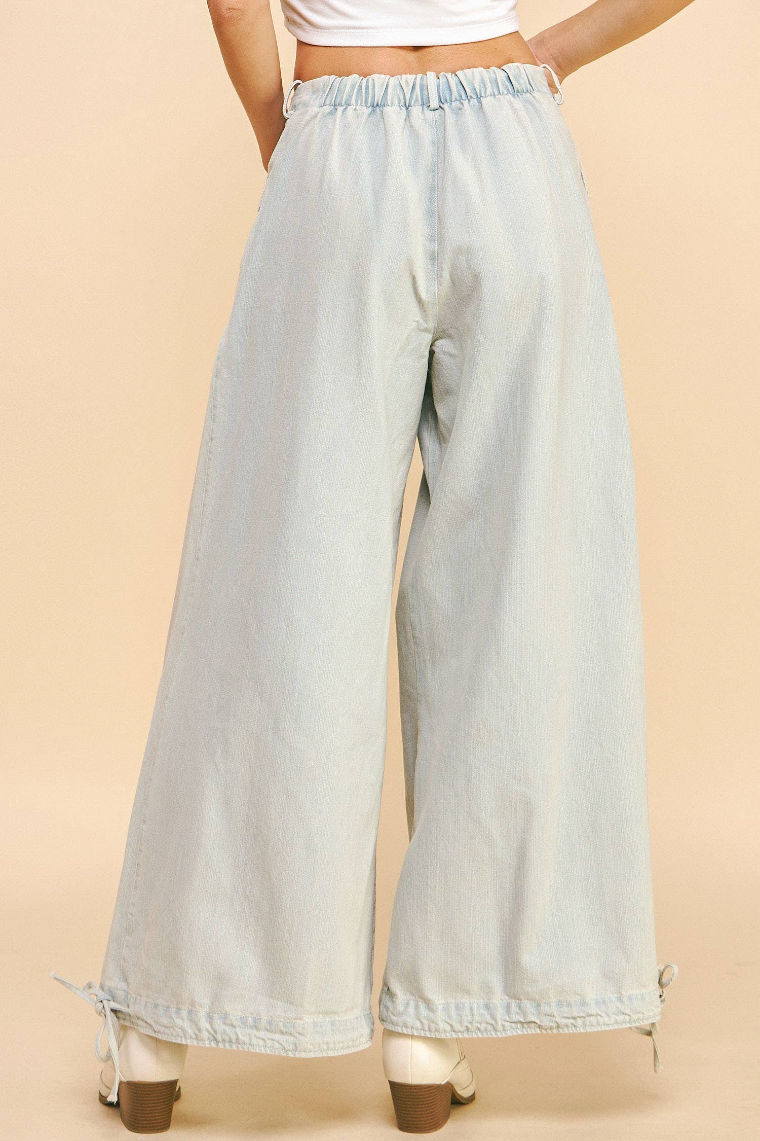 WIDE OPENING ADJUSTABLE BALLOON BOTTOM DETAIL MID-HIGH WAIST DENIM PANTS
